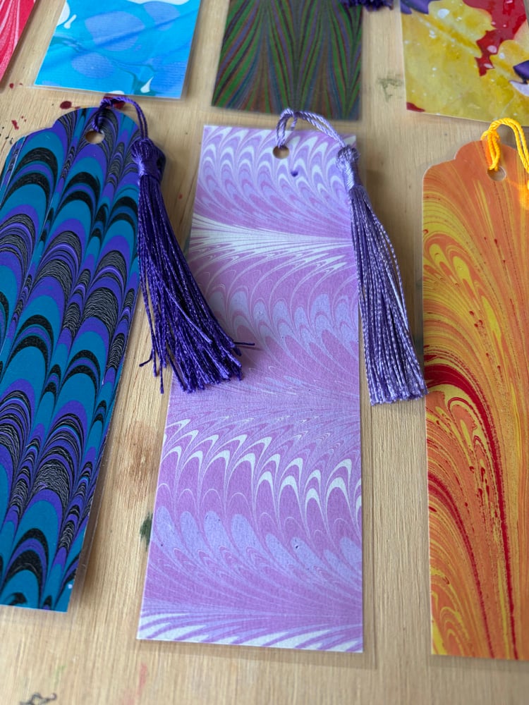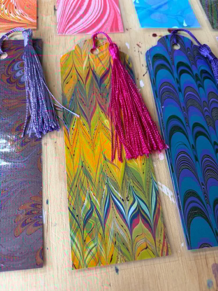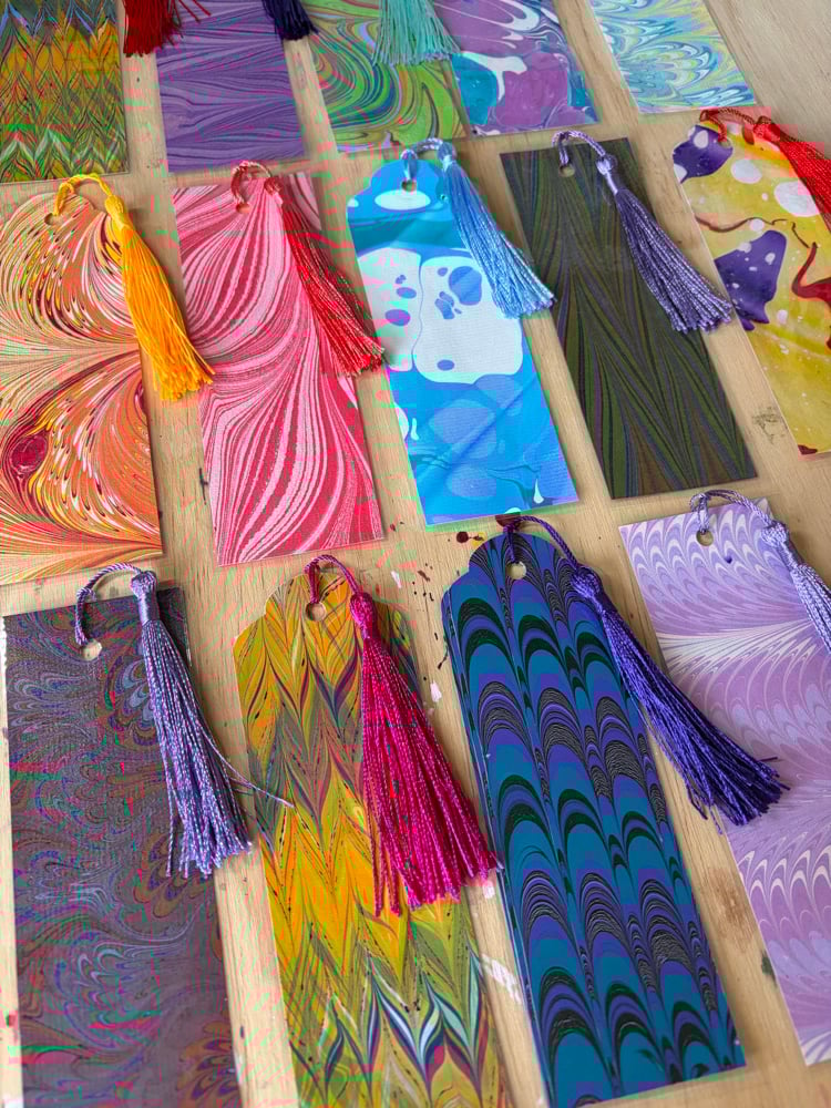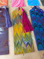 Elevate your reading experience with an original hand-marbled bookmark. Bookmarks each measure 2x6" and have been laminated to protect against the elements. Each bookmark comes with a colorful tassel. All bookmarks are from original hand marbled acrylic paper. No two bookmarks are alike. If you would like a certain color or pattern, please list it in the notes. I will do my best to find one that fits your request.