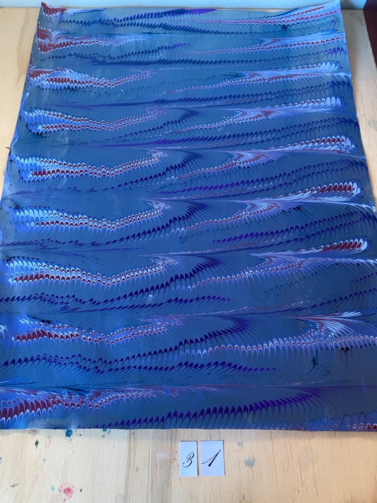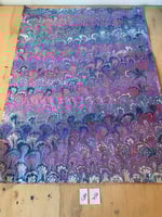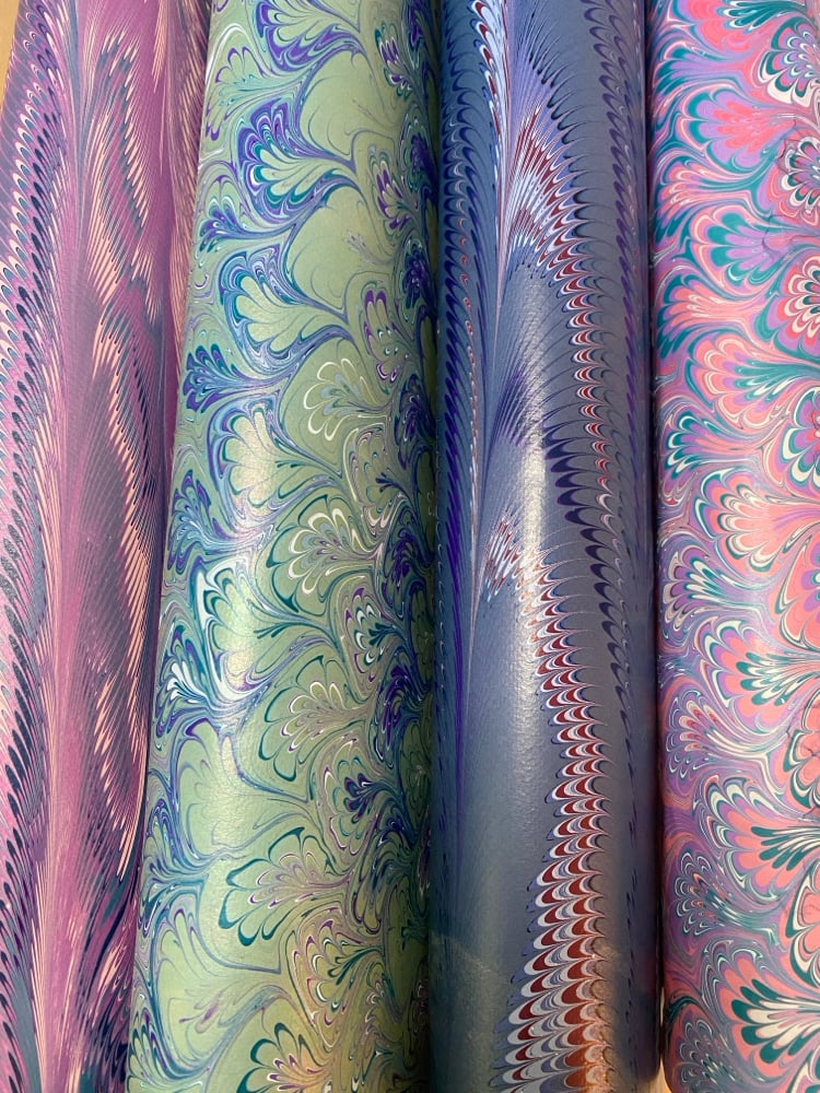 A collection of four original marbled sheets. Each sheet sold individually. The sheets are handmade using acrylic paints. Please select which individual numbered sheet you would like to purchase using the drop down menu. The numbered image you select is an exact image of the paper you will receive. All paper is handmade and could have minor flaws or imperfections.