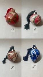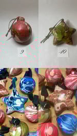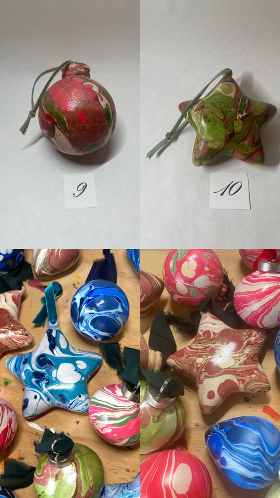 These bisque and wooden ornaments have been hand marbled with acrylic paints and sealed with a glaze finish. Each ornament comes with a velvet or chiffon ribbon. No two ornaments are alike!